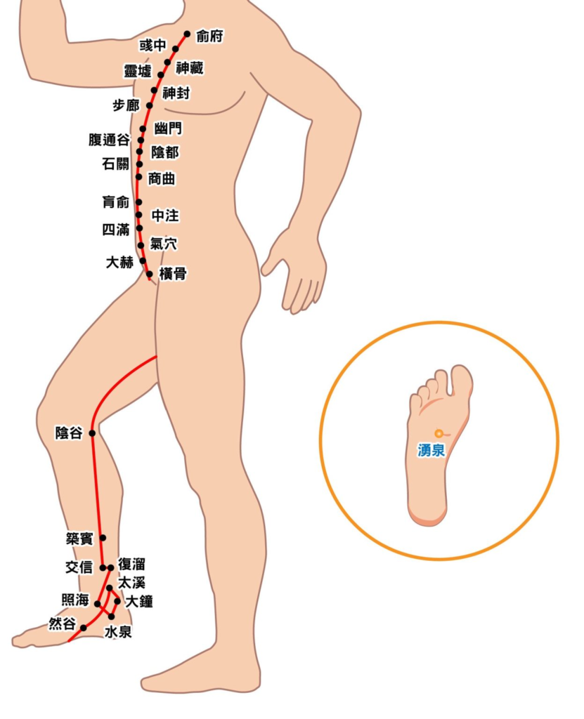 腎經起於足底湧泉穴,沿足內側上行,經踝、脛、膝、大腿內側,